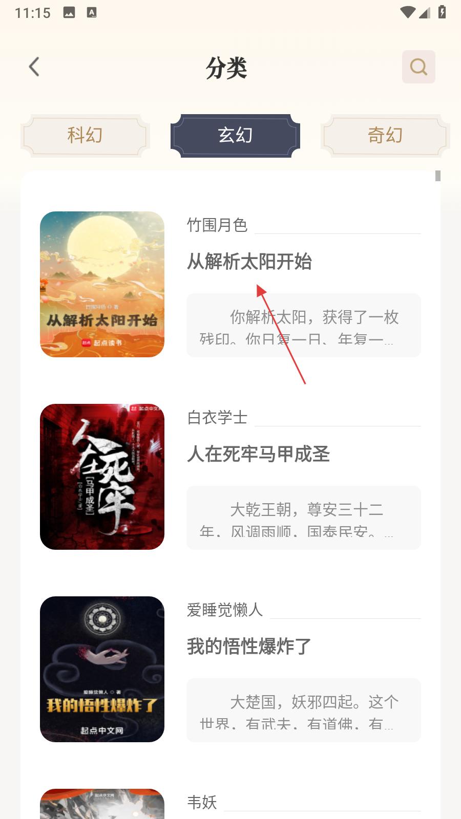 3、切换到玄幻分类,看到从解析太阳开始、人在死牢马甲成圣等玄幻小说,选择心仪的玄幻小说进行查看。