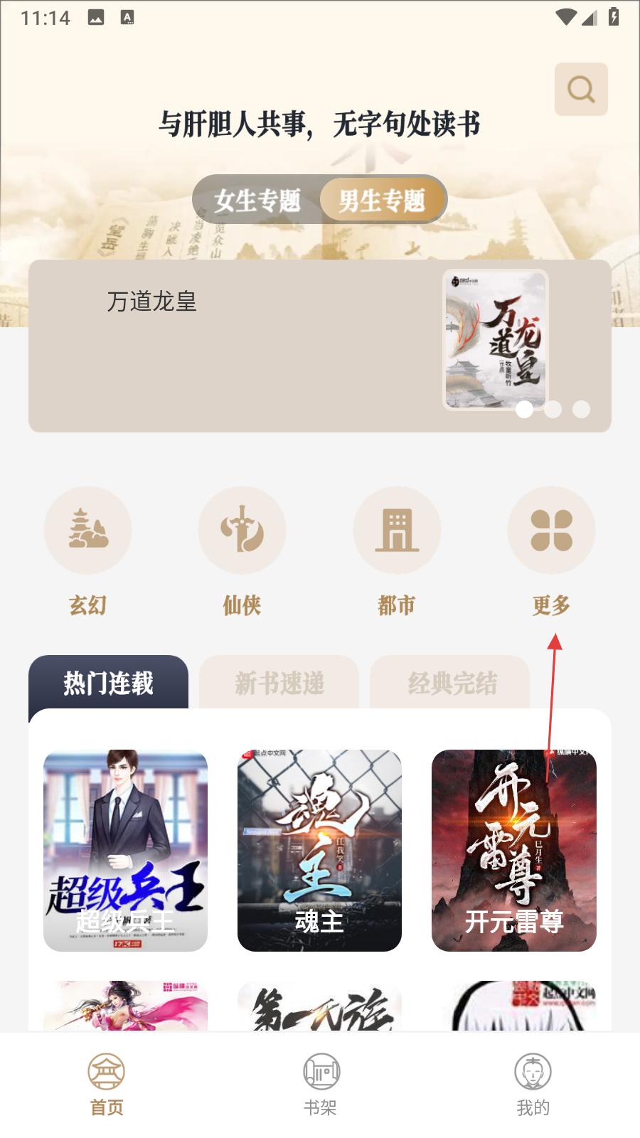 1、打开米禾阅读,进入首页,看到有玄幻、仙侠、都市等分类,还有更多分类选项,点击更多,进入分类页面。