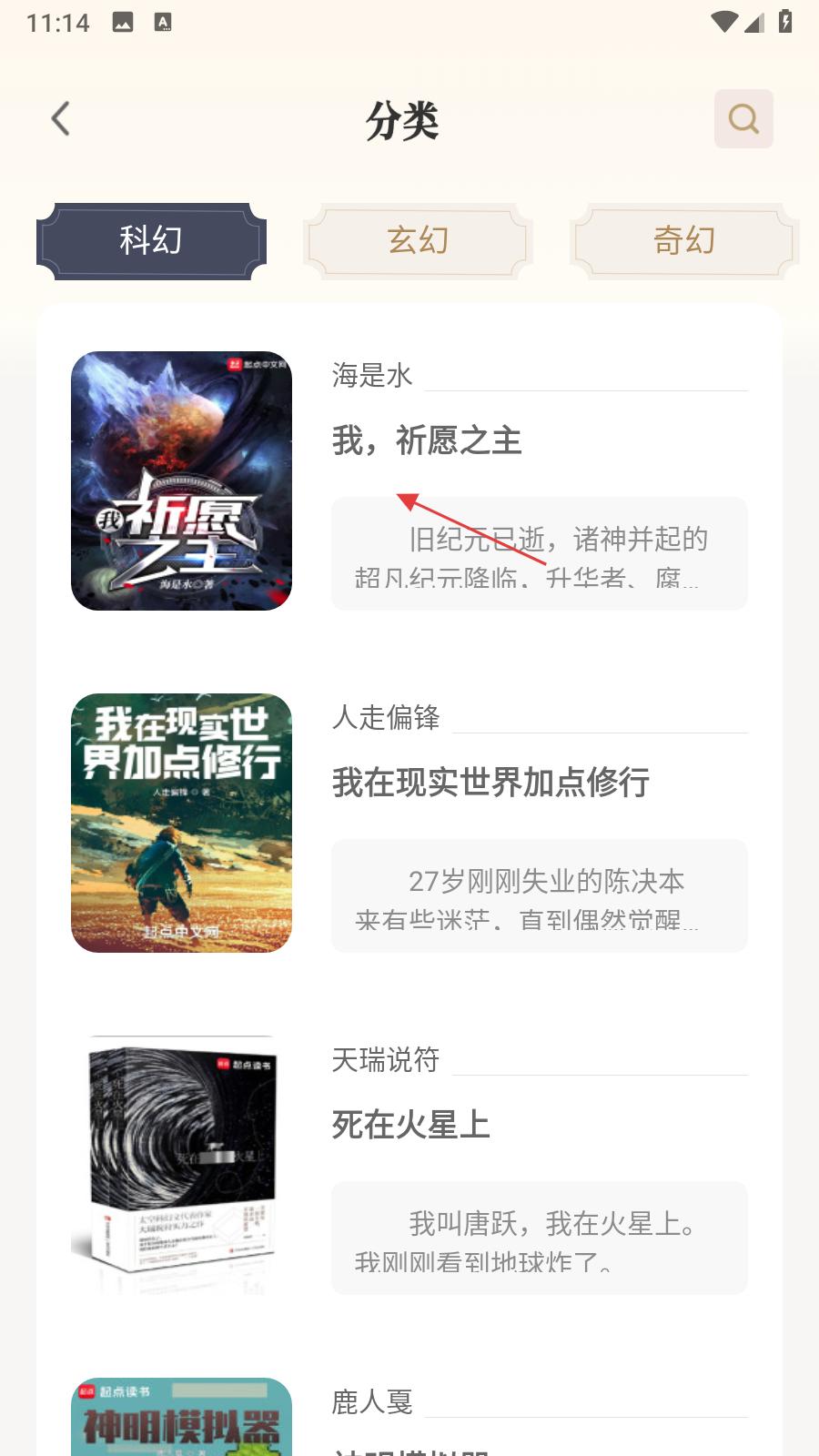 2、在分类页面,切换到科幻分类,看到我祈愿之主、我在现实世界加点修行等科幻小说,可挑选感兴趣的小说。