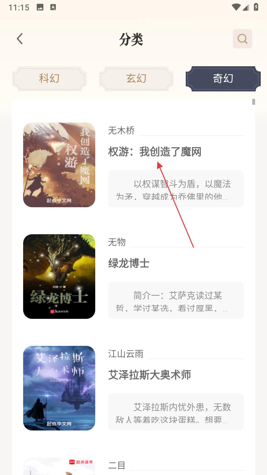 4、切换到奇幻分类,看到权游我创造了魔网、绿龙博士等奇幻小说,挑选喜欢的奇幻小说,开启阅读。