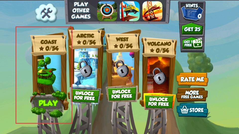 1、进入游戏,选择场景,比如点击COAST下方的PLAY,开启造桥挑战,还有ARCTIC、WEST等场景可解锁体验。