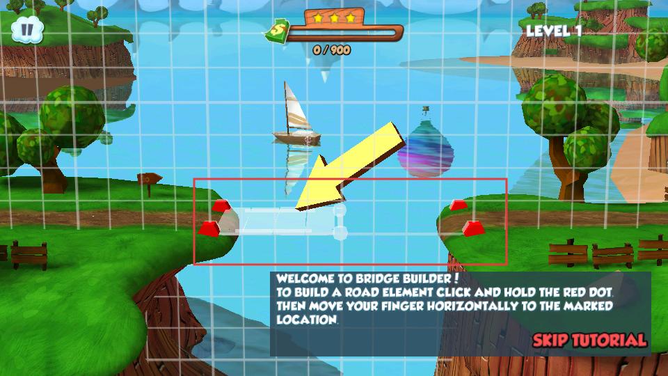 2、在造桥界面,按住红点,水平移动手指到标记位置,搭建道路元素,逐步构建桥梁,让车辆能通行。