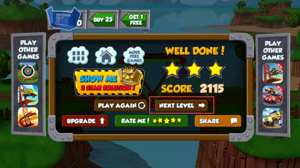 4、成功让车辆通过桥梁后,会显示得分和星级评价,可选择PLAY AGAIN重新挑战,或点击NEXT LEVEL进入下一关。