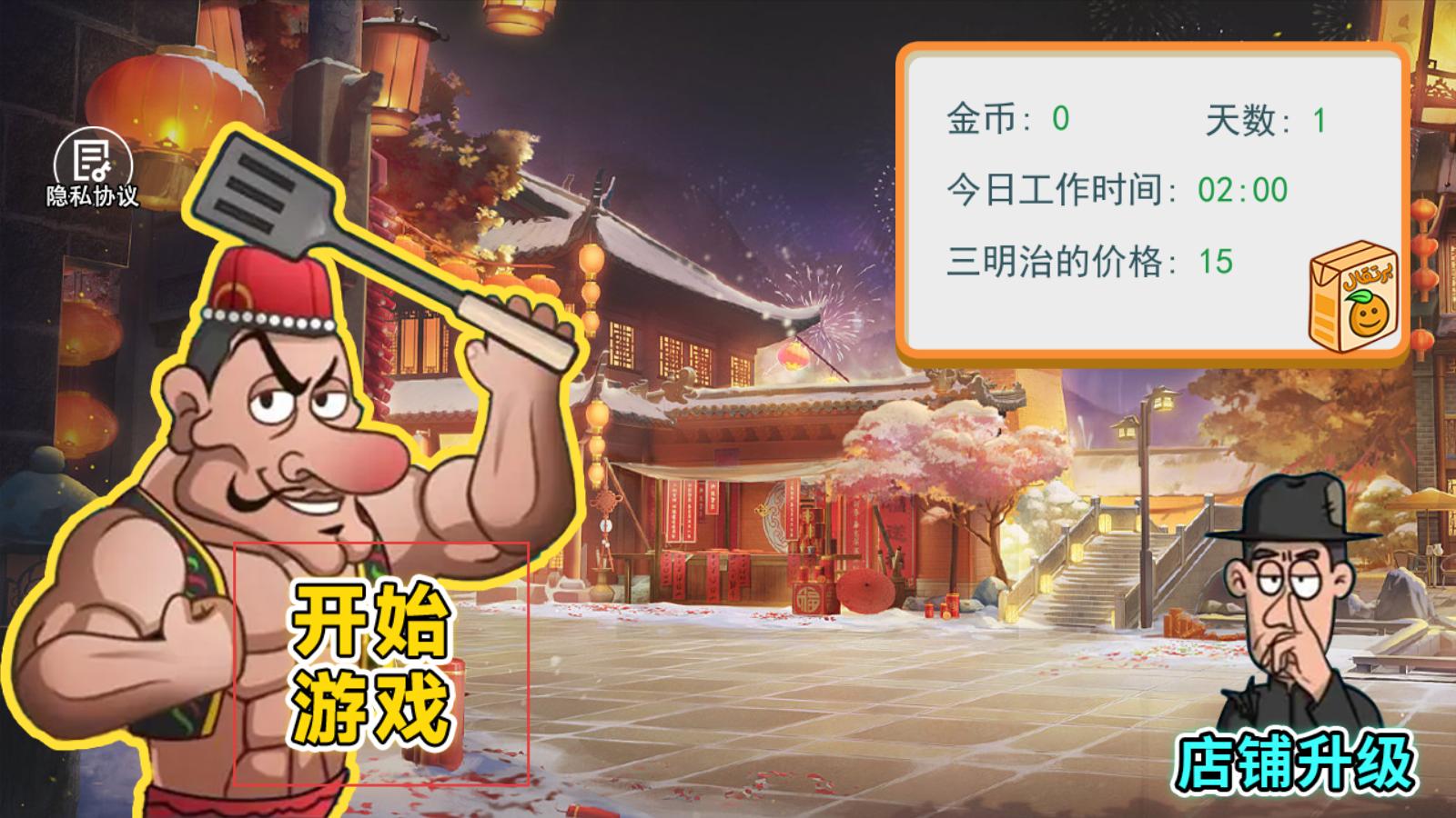 1、进入游戏会看到带有国潮元素的标题界面,界面显示金币、天数等信息,点击开始游戏,开启烤肉店经营之旅。