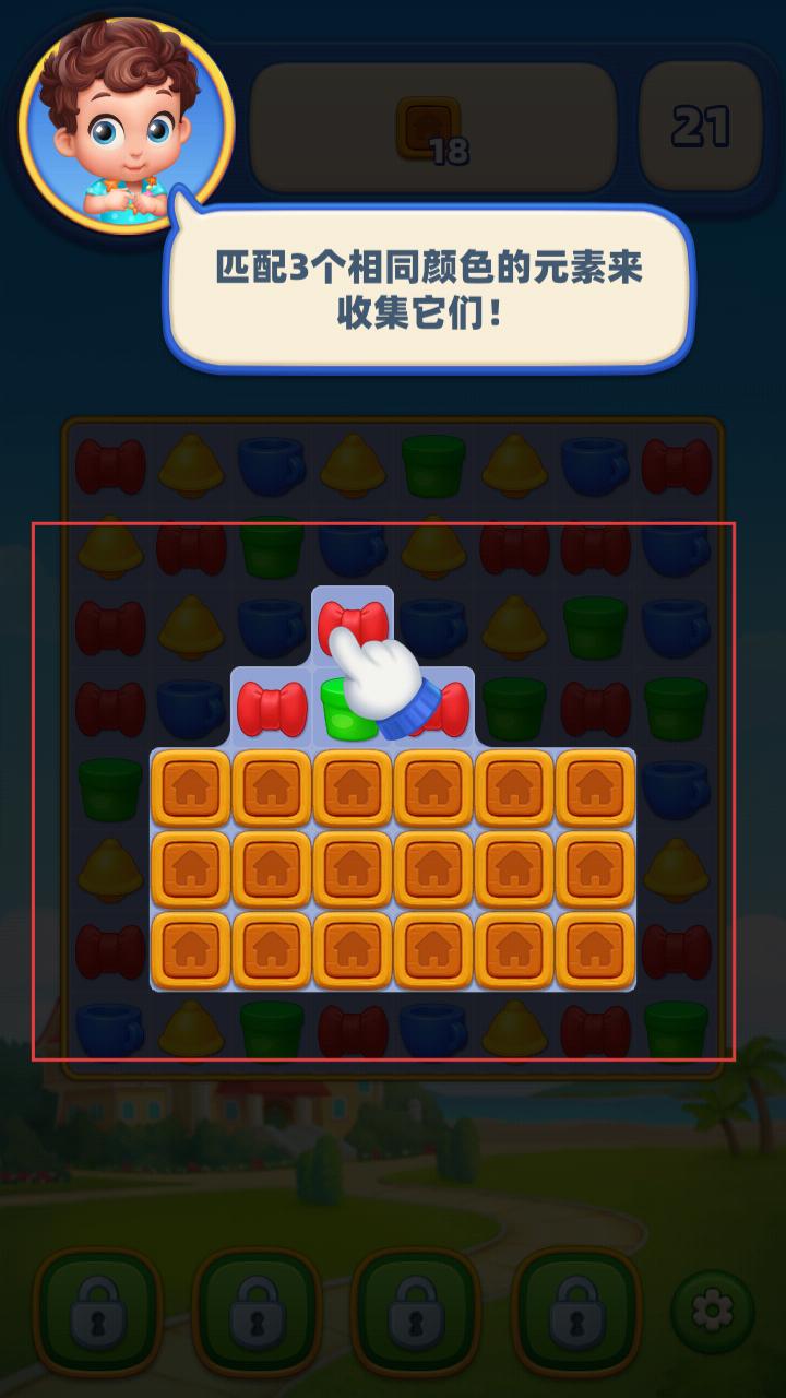 1、进入游戏,按照提示匹配3个相同颜色的元素,通过交换相邻元素的位置,让它们凑成一组,完成收集。
