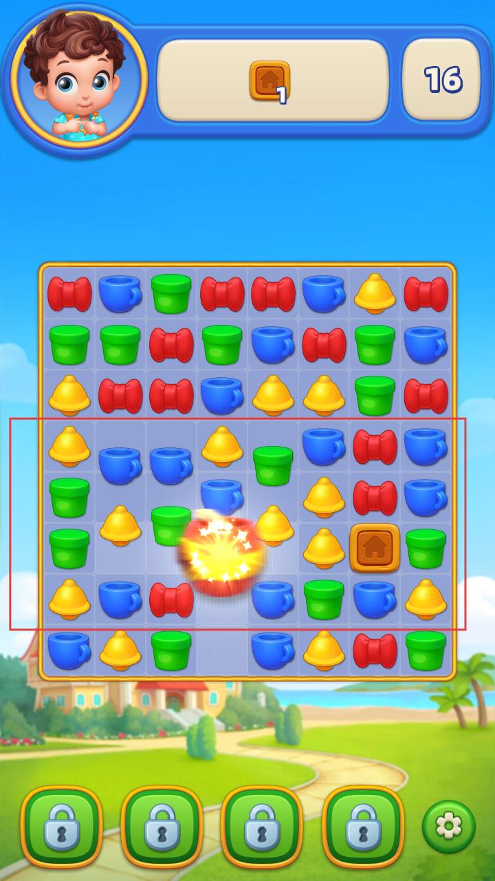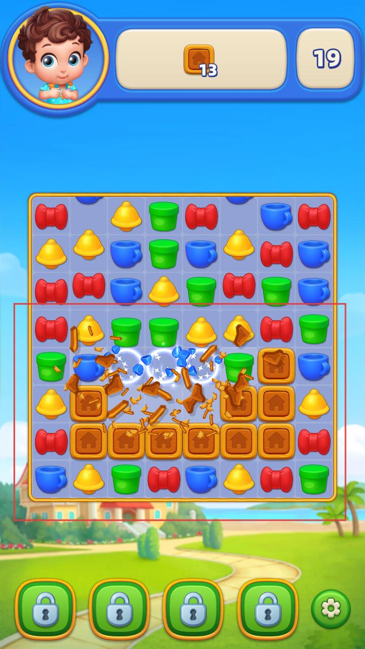 2、持续进行消除操作,当消除到一定程度,会触发特殊效果,能看到元素伴随着特效破碎,推进游戏进程。