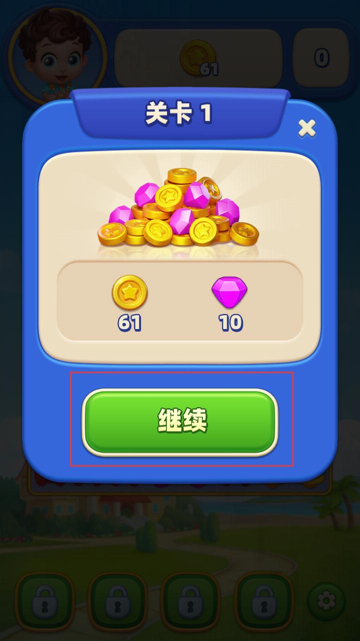 4、成功通关后,会获得金币和钻石奖励,点击继续按钮,就可以进入下一关,继续度假村的建设之旅。