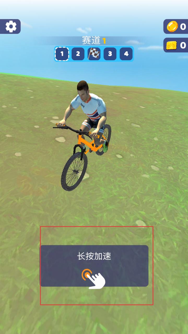 1、进入游戏,长按加速按钮,控制自行车在赛道上前行,开启骑行挑战,感受风驰电掣的速度。