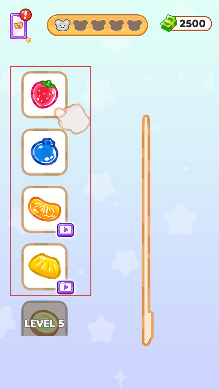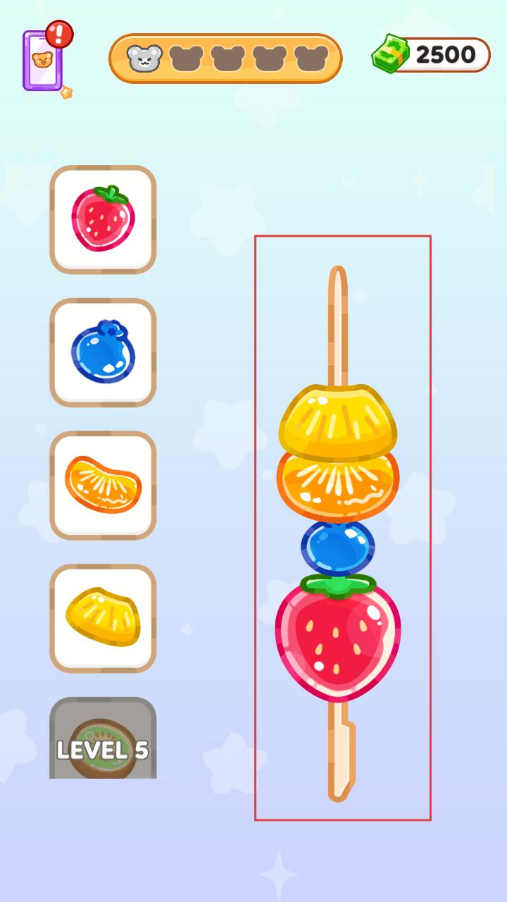 1、选择草莓、蓝莓、橘子、菠萝等食材,按照提示操作,为制作美食串做准备,逐步挑选食材,丰富美食串的搭配。