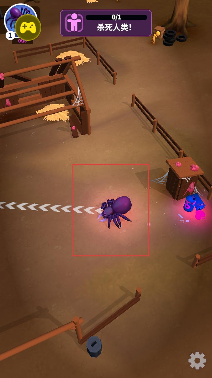1、操控紫色蜘蛛在场景中移动,目标是杀死人类,开启生存与进化之旅,在这个过程中探索场景,寻找猎物,逐步提升蜘蛛的生存能力。