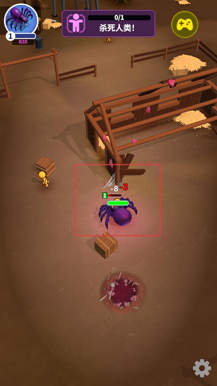 2、蜘蛛攻击人类,造成伤害,积累进化资源,同时留意自身血量,持续捕食以推进进化,通过不断攻击强化蜘蛛的战斗与生存实力。