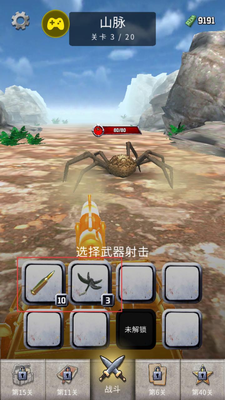 1、在遭遇巨型蜘蛛后,可选择子弹、钩子等武器,开启与蜘蛛的战斗,在3D山脉场景中开启冒险。