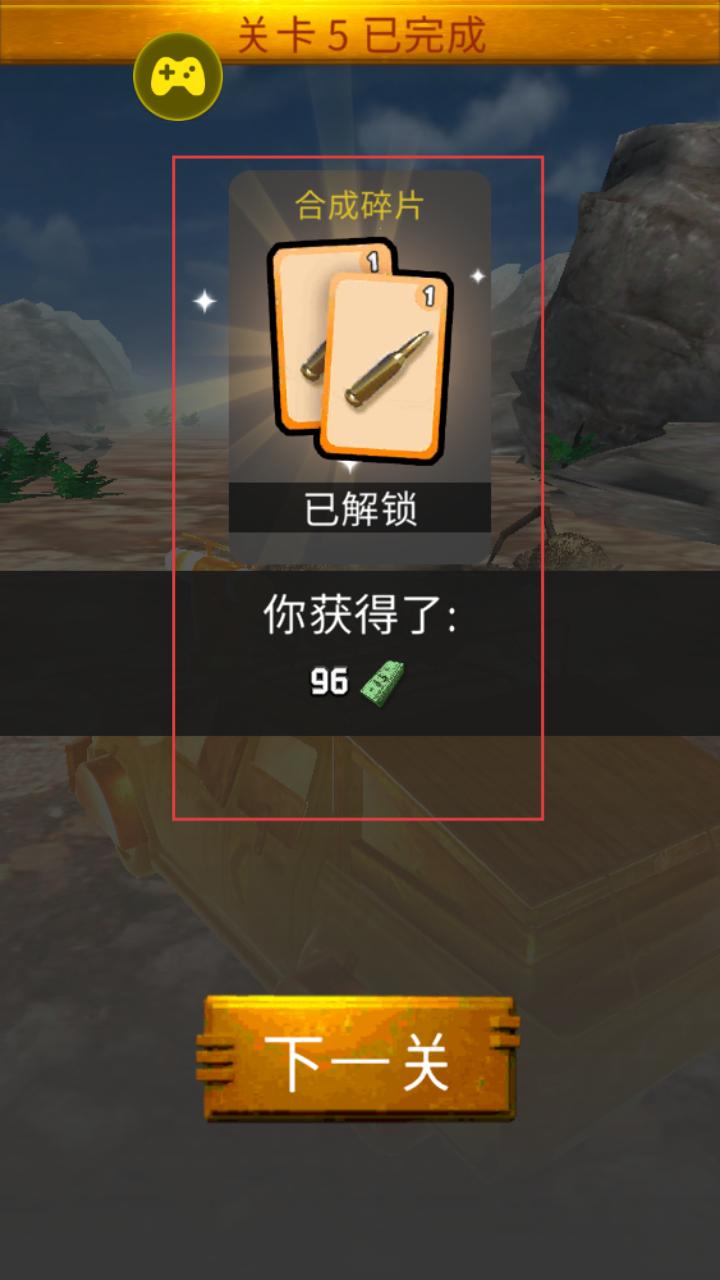 3、完成关卡后可获得合成碎片和金钱,如关卡5完成解锁子弹碎片,积累资源助力后续冒险与武器升级。