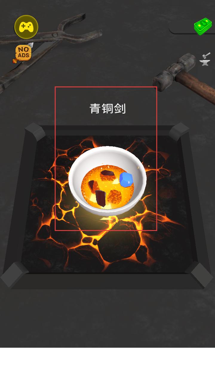 2、选择材料熔炼青铜剑,将金属等材料放入熔炉,通过高温使其融合,开启打造青铜剑的第一步,期待熔液的形成。