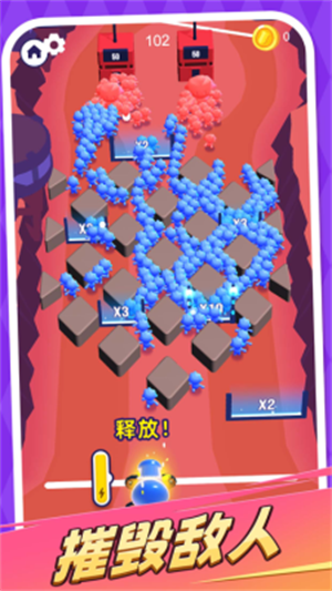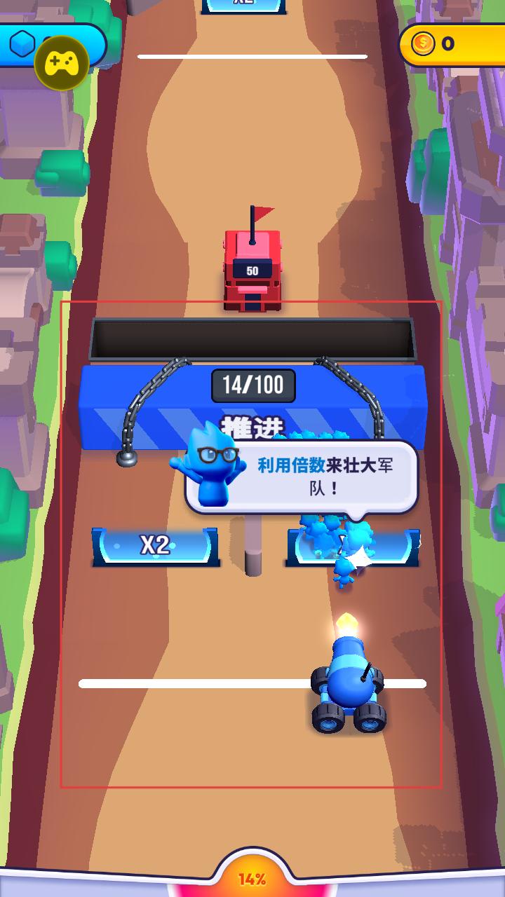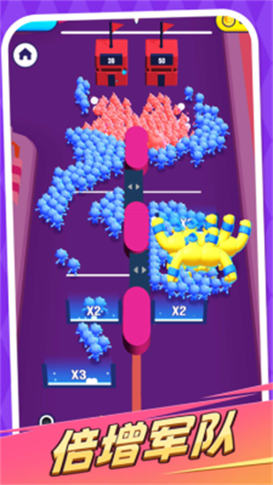 1、长按以射击,生成蓝色小人队伍,开启战斗,准备利用倍数门壮大队伍,推进战斗进程,开启策略对战之旅。