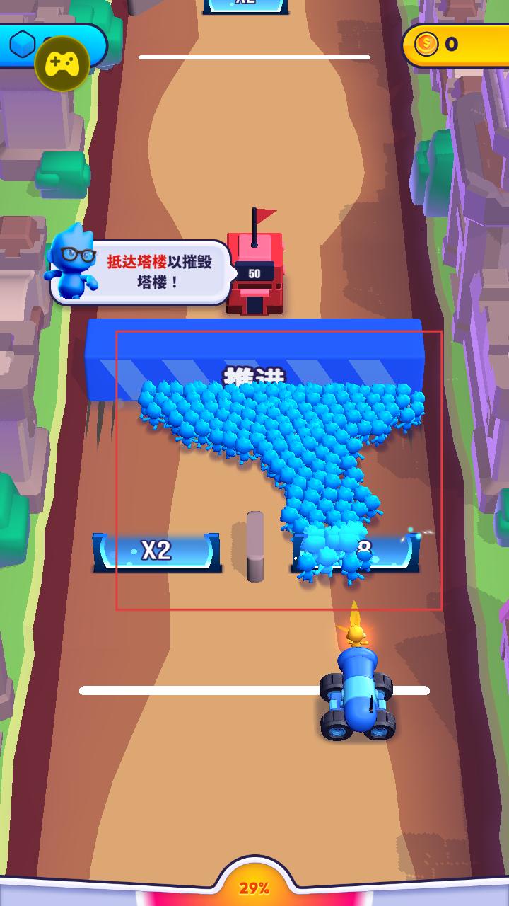 2、利用倍数门,让蓝色小人队伍数量倍增,壮大军队,同时推进战斗进度,向塔楼目标迈进,提升战斗优势。