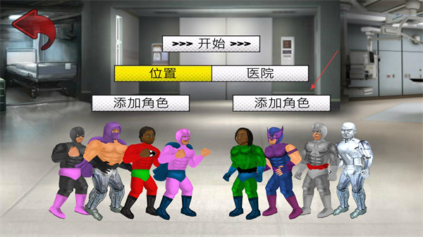 1、在医院场景中点击添加角色按钮,选择想要操控的英雄角色,完成角色添加后点击开始按钮,即可进入游戏的下一步流程。