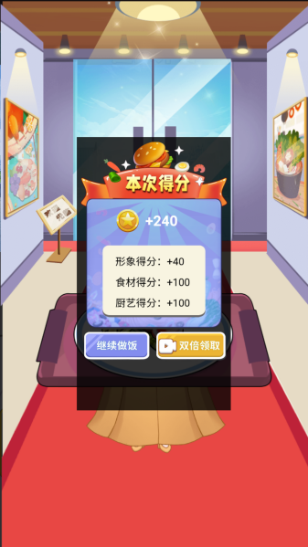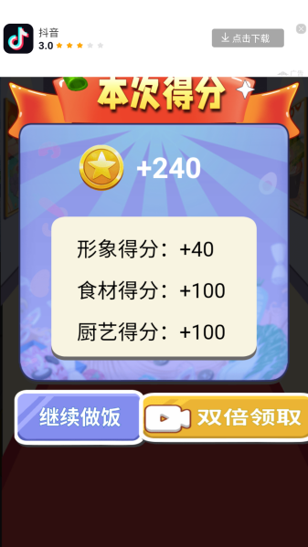 3、完完成烹饪后提交作品,查看形象分、食材分与厨艺分总和,解锁下一关卡与新道具。