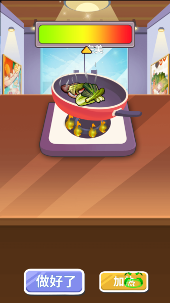 2、点击食材放入锅中,长按右下角加热键,待指针指向“完美”时停止以保证厨艺分。