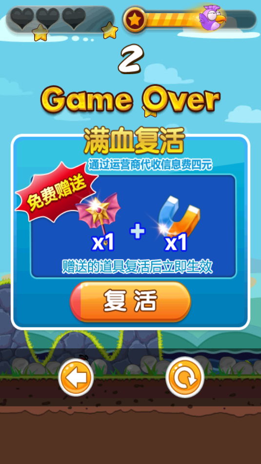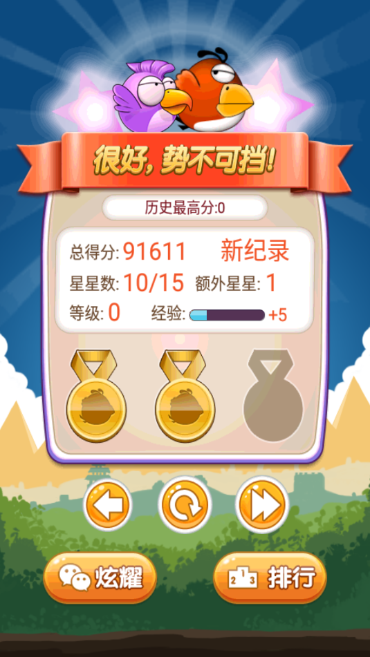 2、游戏里,需点击屏幕让小鸟跳跃飞行,并吃到星星获得分数。
