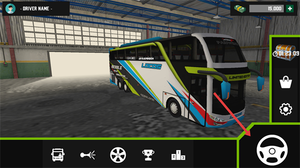 1、在车库界面点击方向盘按钮,进入驾驶准备阶段,可查看巴士外观,准备开启城市巴士驾驶任务。