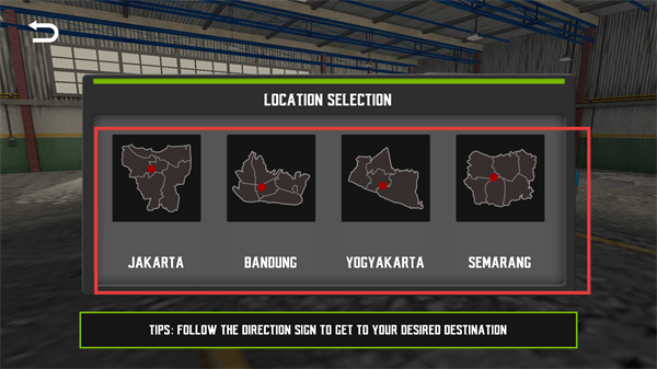 2、进入地点选择界面,可选择Jakarta、Bandung、YOGYAKARTA、SEMARANG等目的地,选定后开启巴士运输旅程。