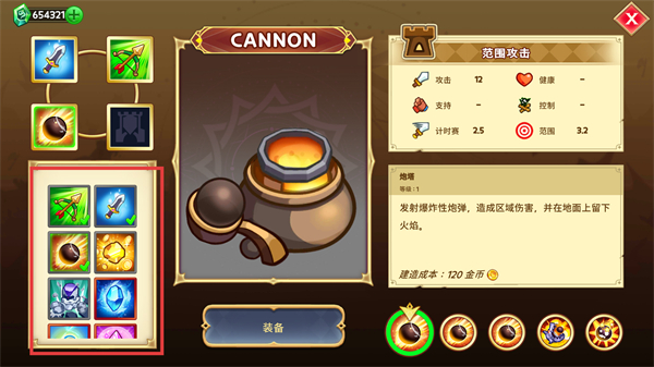 1、在塔选择界面找到CANNON塔,查看其发射爆炸性炮弹并留火焰的效果,确认属性信息后,点击装备按钮来装配该塔用于防御。