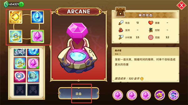 2、切换到ARCANE塔的界面,了解其发射光束随时间增加单个目标伤害的效果,查看属性后点击装备,更换该塔以调整防御配置。