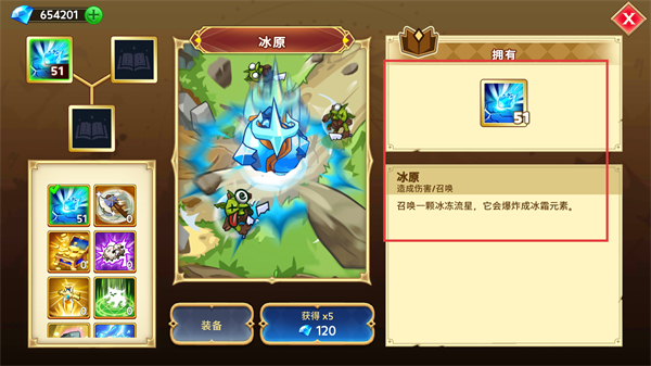 3、进入冰原技能界面,查看其召唤冰宝转化为冰元素的效果,确认当前持有数量后,可点击获取按钮增加该技能的使用次数。