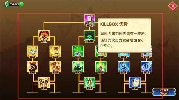 4、在天赋树界面查看KILLBOX优势效果,了解周围塔能提升攻击力的加成规则,借助该天赋来强化已布置塔群的防御能力。