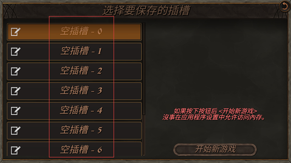 1、选择列表中的空插槽,确定游戏进度的保存位置,之后点击开始新游戏,开启中世纪冒险流程。