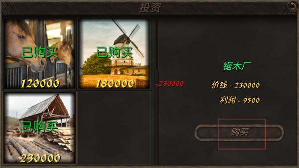 4、在投资界面点击购买按钮,获取锯木厂产业,后续可通过该产业获得对应的利润收益。