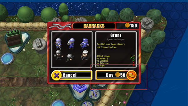 3、进入兵营界面选定Grunt兵种,点击Buy按钮消耗货币招募该单位,补充己方作战兵力。
