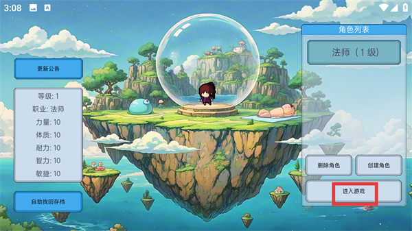 1、选择已创建的法师角色,点击进入游戏按钮,进入这个像素风格的奇幻冒险世界。