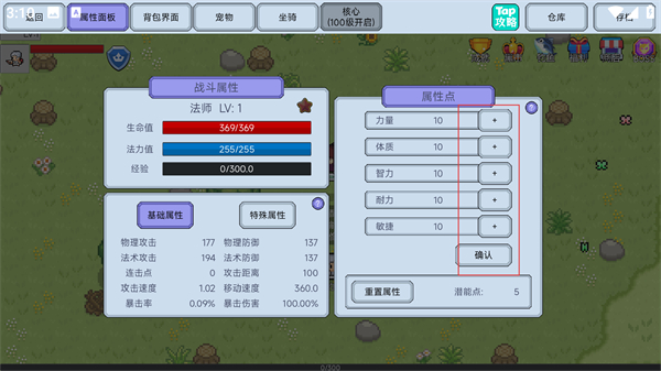 3、打开属性面板,调整力量体质等属性点,设置完成后点击确认按钮保存属性配置。