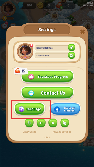 2、在设置界面点击Language按钮,进入语言选择页面,为切换游戏显示语言做准备。