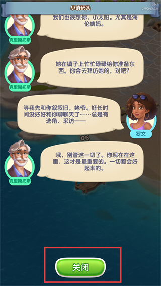 4、阅读完小镇相关的剧情对话后,点击关闭按钮,结束当前对话界面,继续推进小镇经营流程。