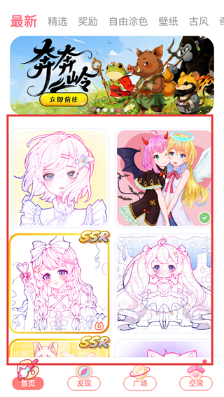 1、在图案选择界面挑选喜欢的涂色素材,查看不同风格的插画,准备开始涂色创作。