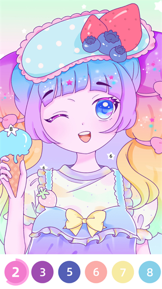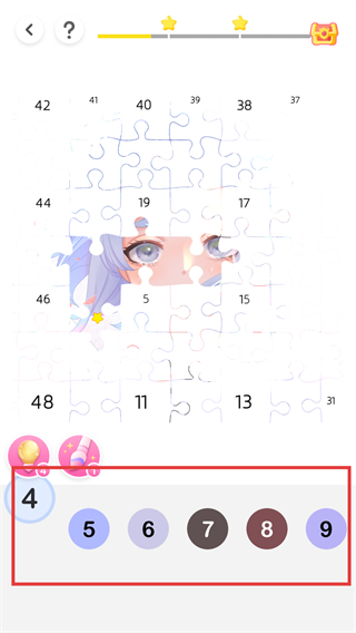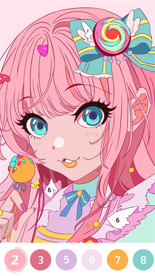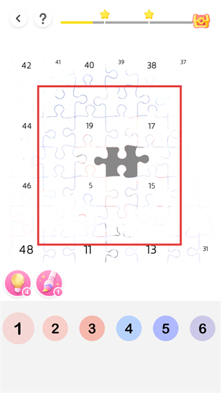 2、进入拼图式涂色关卡,根据数字提示,选择对应序号的色块,开始填充图案区域。