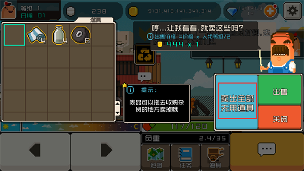 3、打开道具界面选中要售卖的废品,点击卖出按钮,将这些废品出售,获取对应的收益。