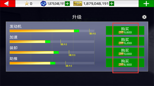 2、在升级页面,点击对应性能项右侧的购买按钮,消耗积分提升该项性能,增强赛车的行驶表现。