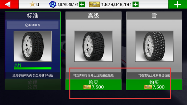 3、进入轮胎选择界面,点击高级或雪轮胎对应的购买按钮,消耗积分获取对应类型的轮胎,适配不同赛道。