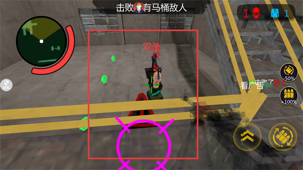 2、操控角色攻击场景中的马桶敌人,成功击败多个敌人后可触发双杀提示,推进关卡进度。
