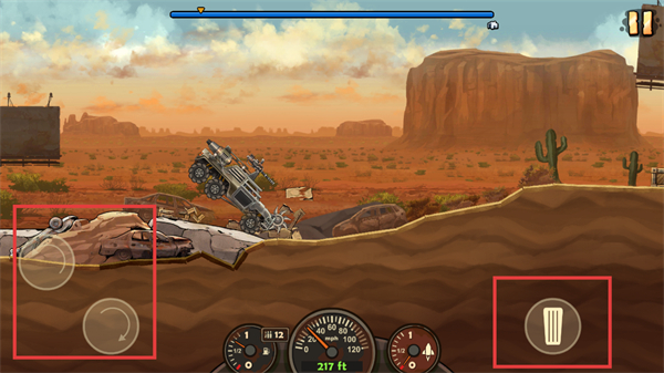 2、操作界面的控制按钮,调整战车的行驶状态,避开障碍物,同时点击对应按钮强化战车,提升推进能力。