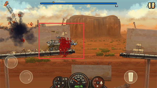 3、驾驶战车撞击道路上的僵尸,造成僵尸损伤,同时持续推进战车,积累前进的距离数值。