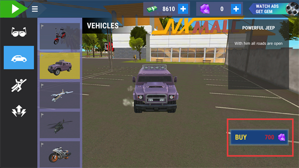 1、进入VEHICLES界面,消耗对应的资源点击BUY按钮,购买新车辆,解锁更多可驾驶的载具类型。