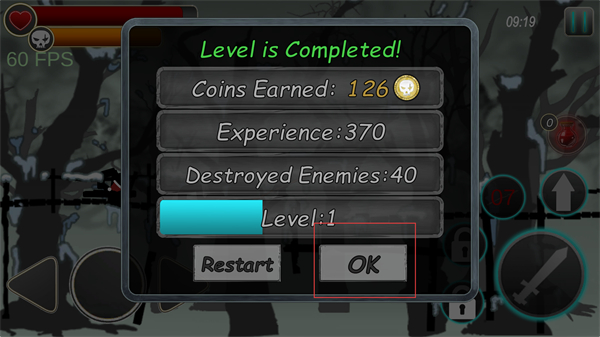 4、关卡完成后查看获得的金币经验等奖励,点击OK按钮确认结算,结束当前关卡流程。