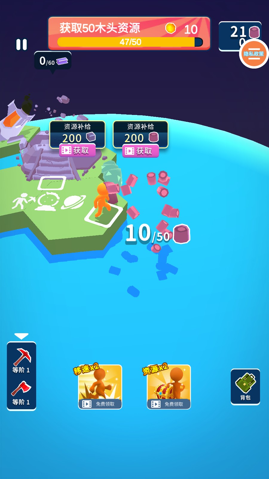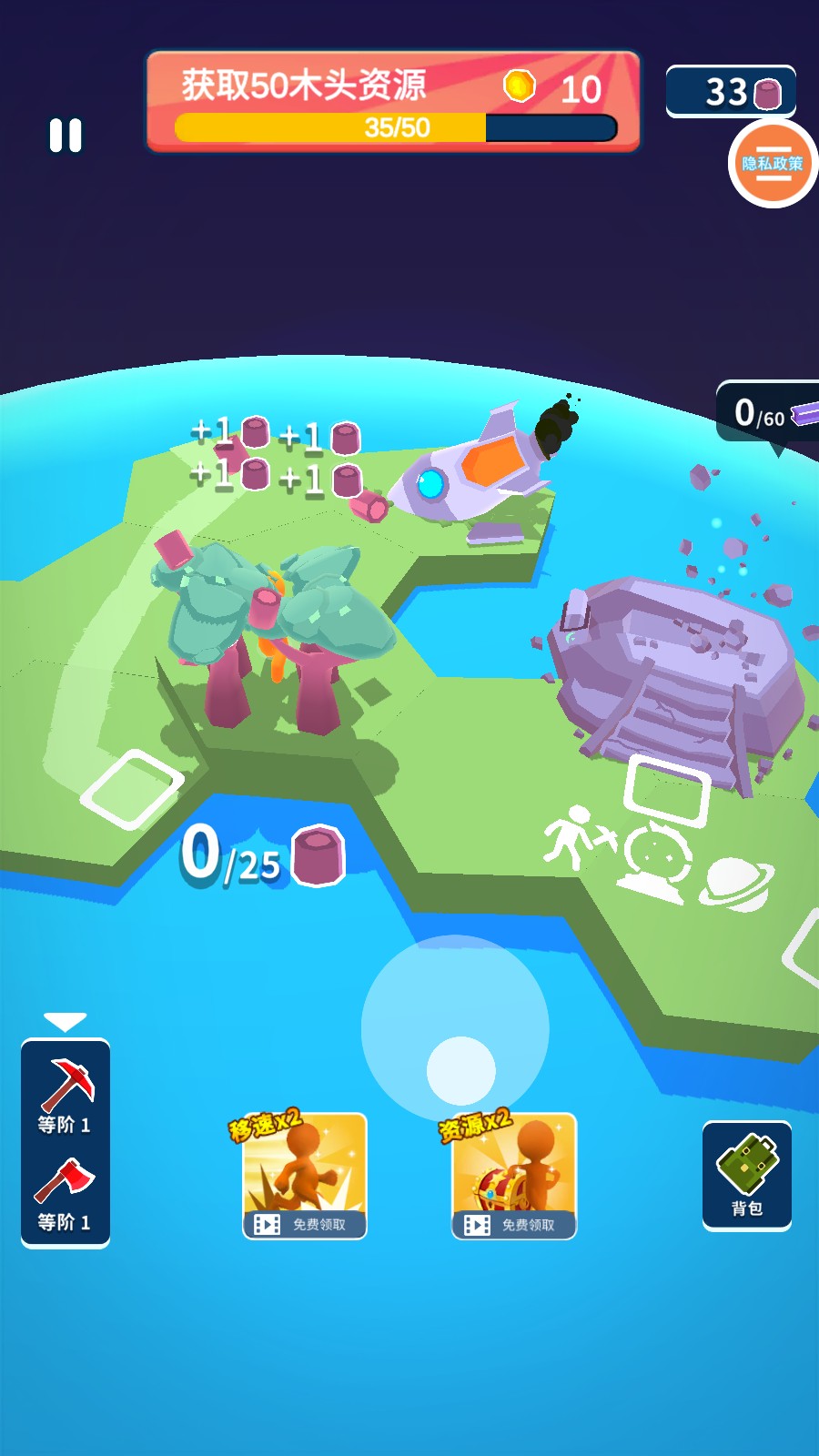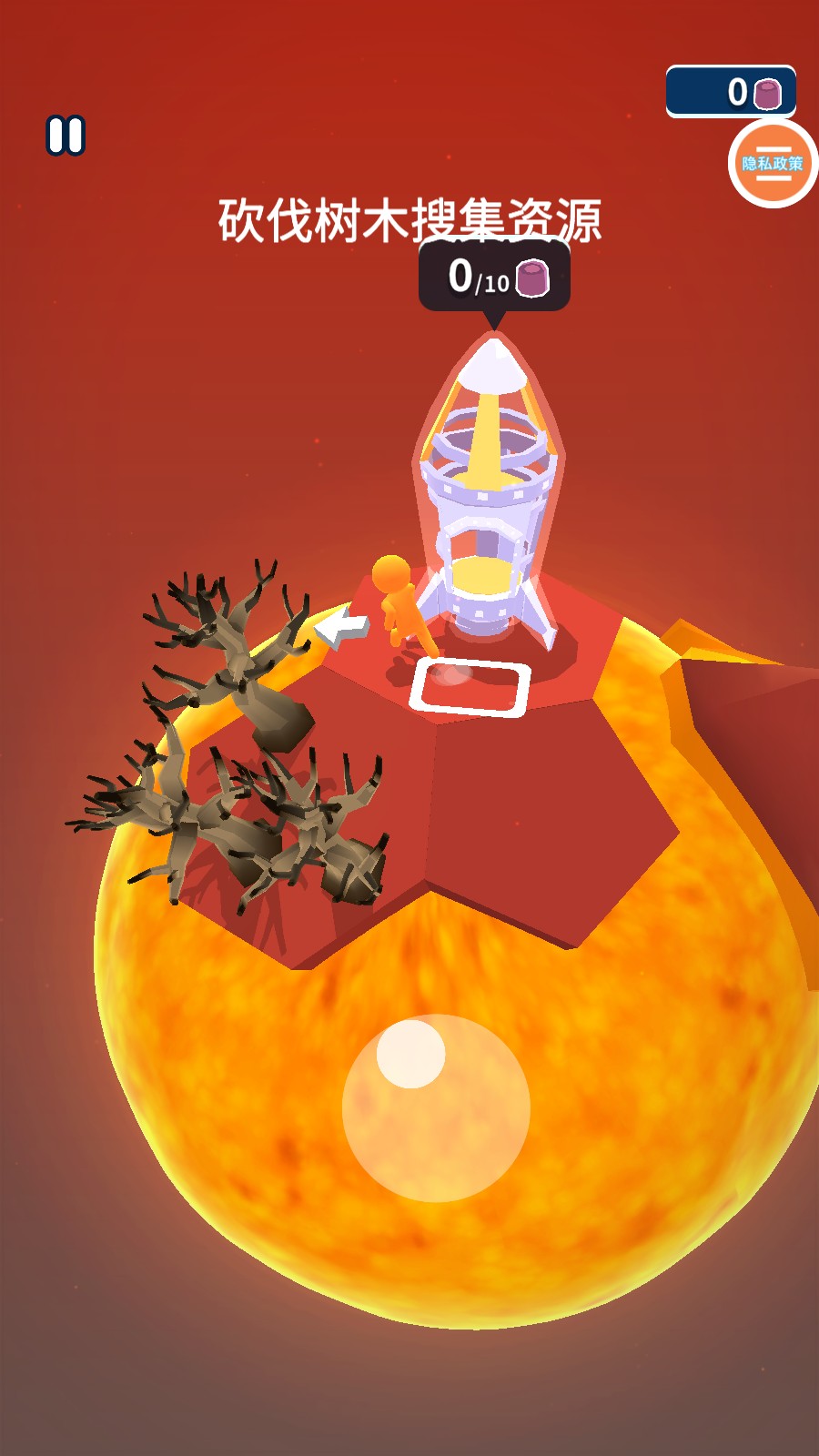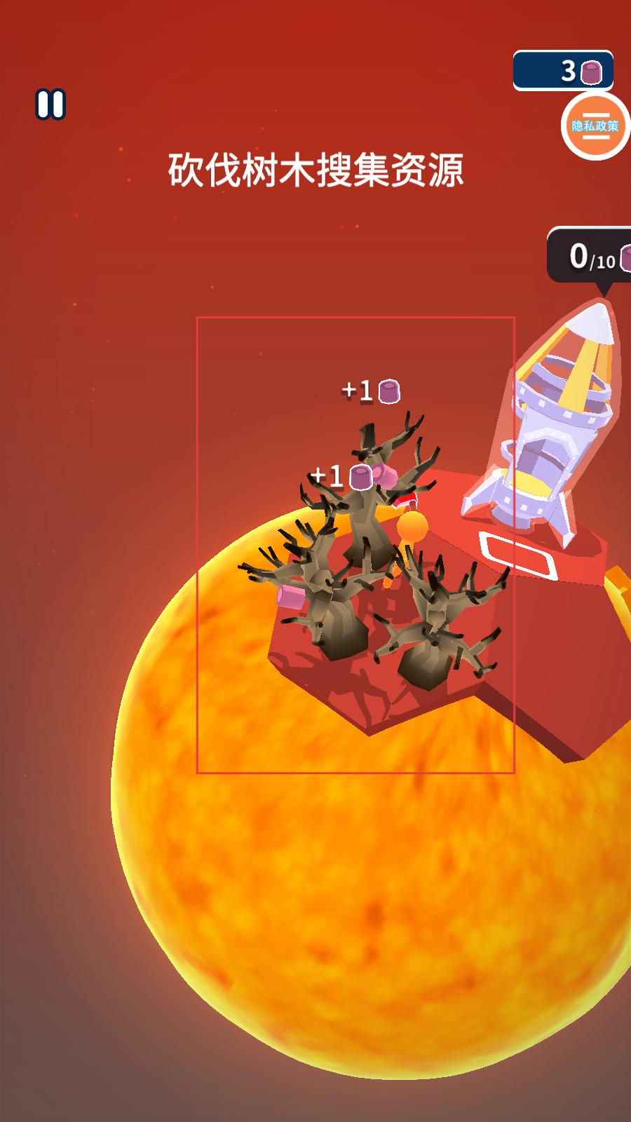 3、找到树木后,进行砍伐,搜集资源,每砍伐一棵树木,都能获得相应的资源,积累修复火箭的材料。