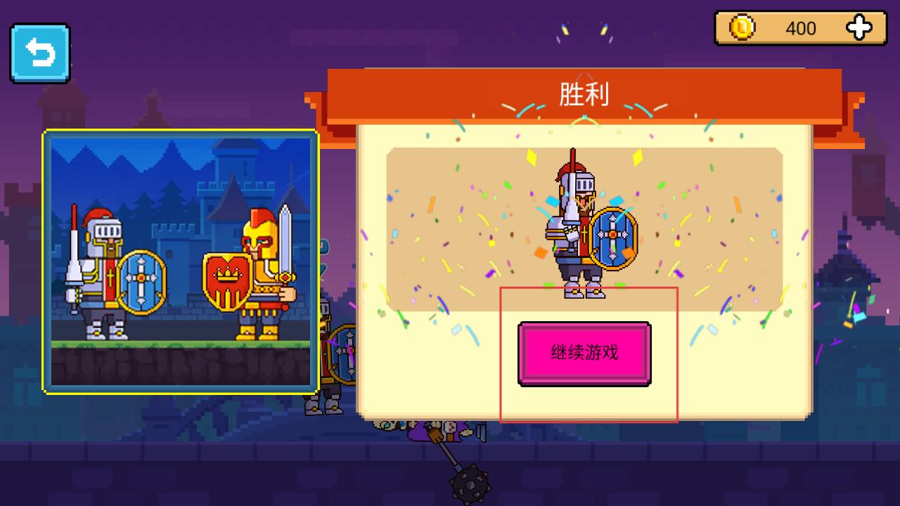 4、成功击败敌人后,会出现胜利界面,此时点击继续游戏按钮,开启下一场格斗战斗,继续挑战。
