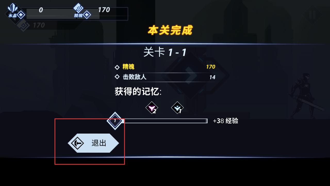 4、成功完成关卡后,会显示关卡完成的相关信息,此时可点击退出,结束本关卡战斗,准备挑战下一关。